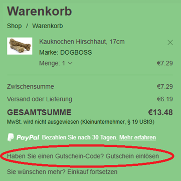 Im Warenkorb klicken sie auf Gutschein einlösen, die Eingabemaske erscheint. Code eingeben & einlösen.
